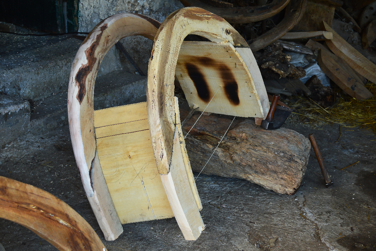 1) Arcioni: Sono dei pezzi di legno lunghi e curvi provenienti dalla lavorazione di particolari rami o da radici che si trovano in natura, i migliori provengono da alberi di faggio, orniello o quercia. La modellazione del legno avviene mediante la sega e l’ascia. Nella foto seguente è possibile vedere un arcione lavorato e gli arcioni allo stato naturale